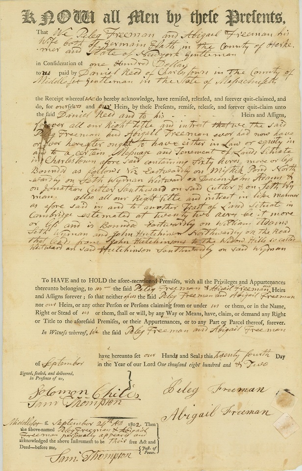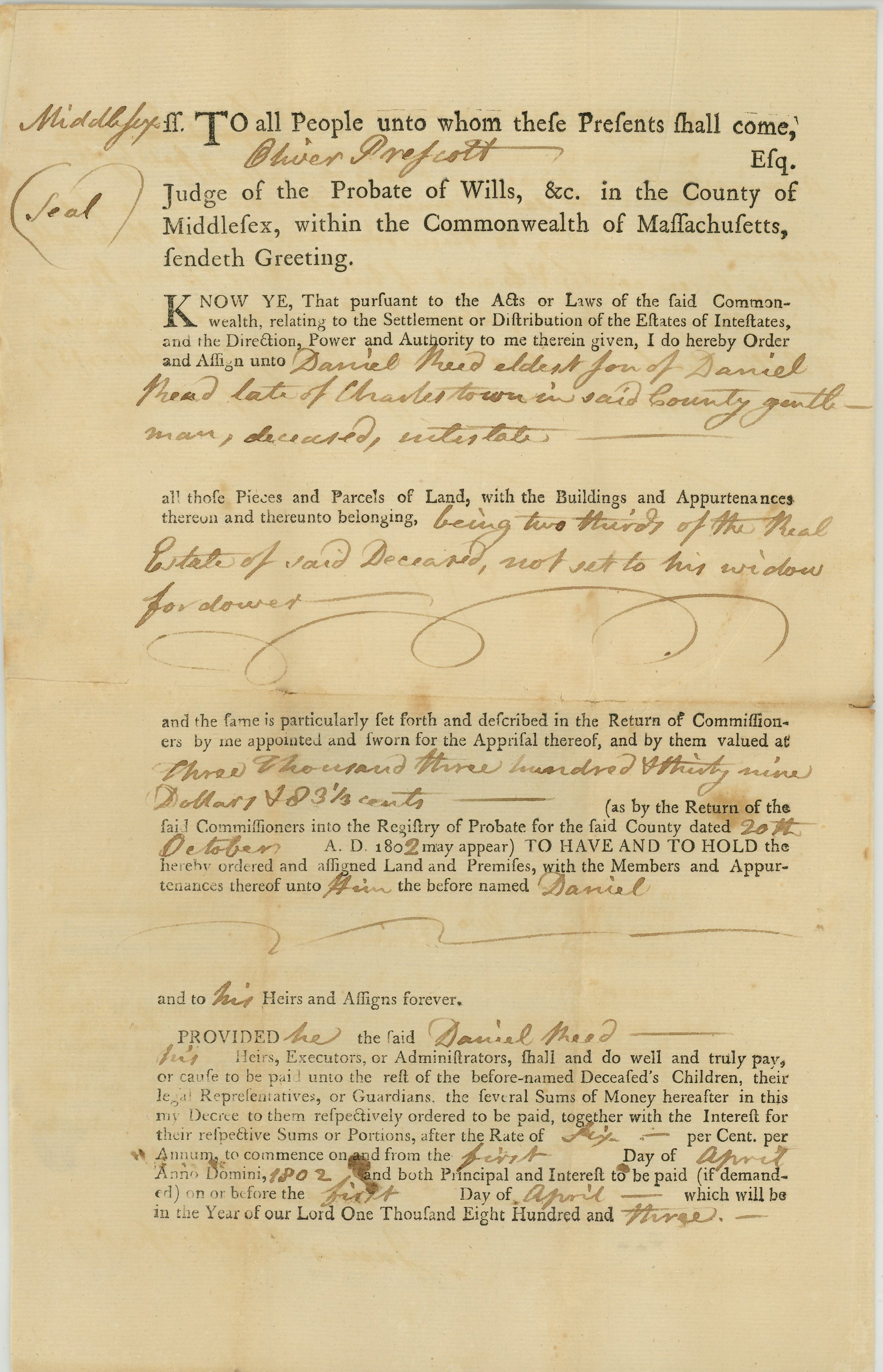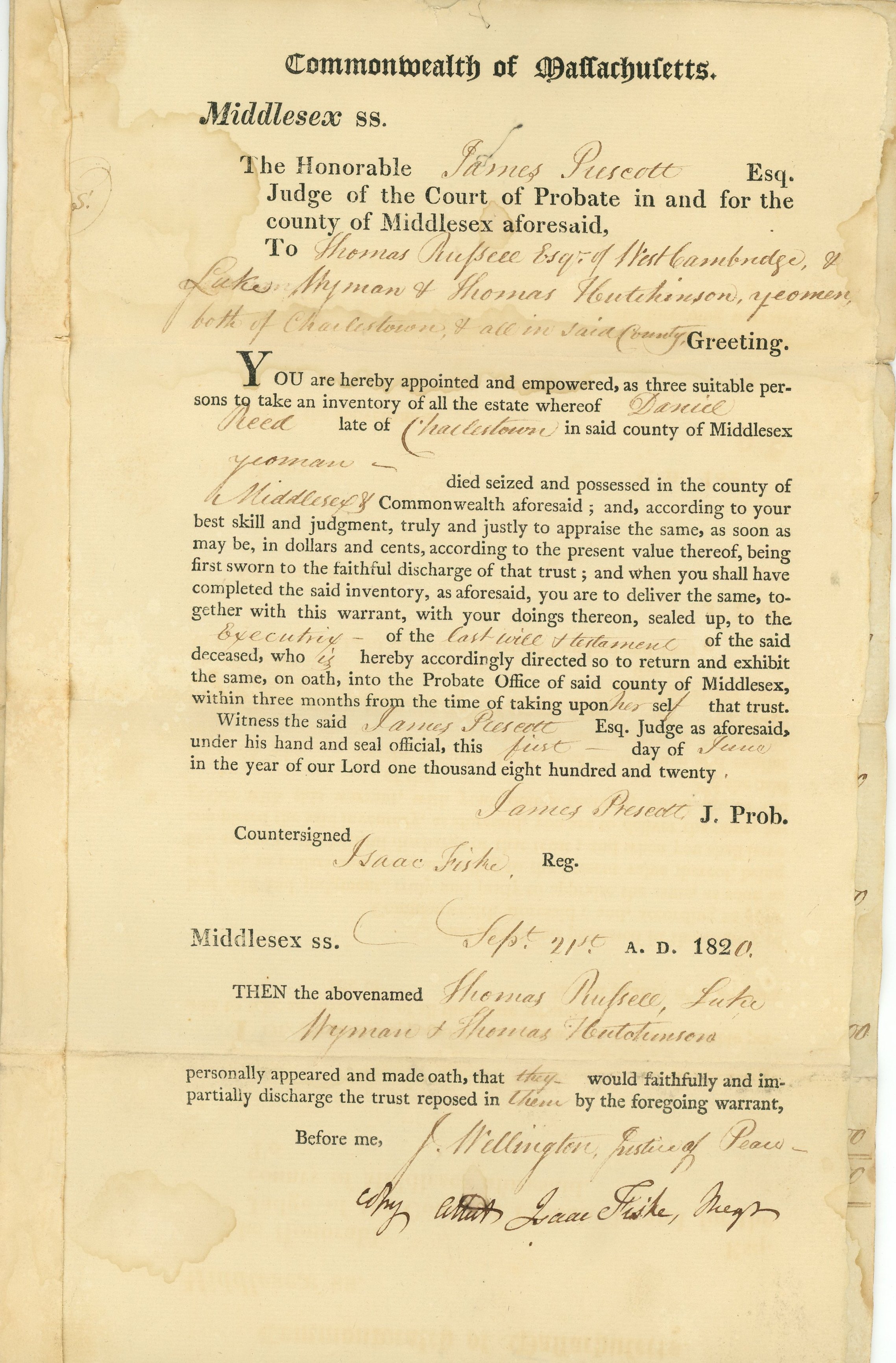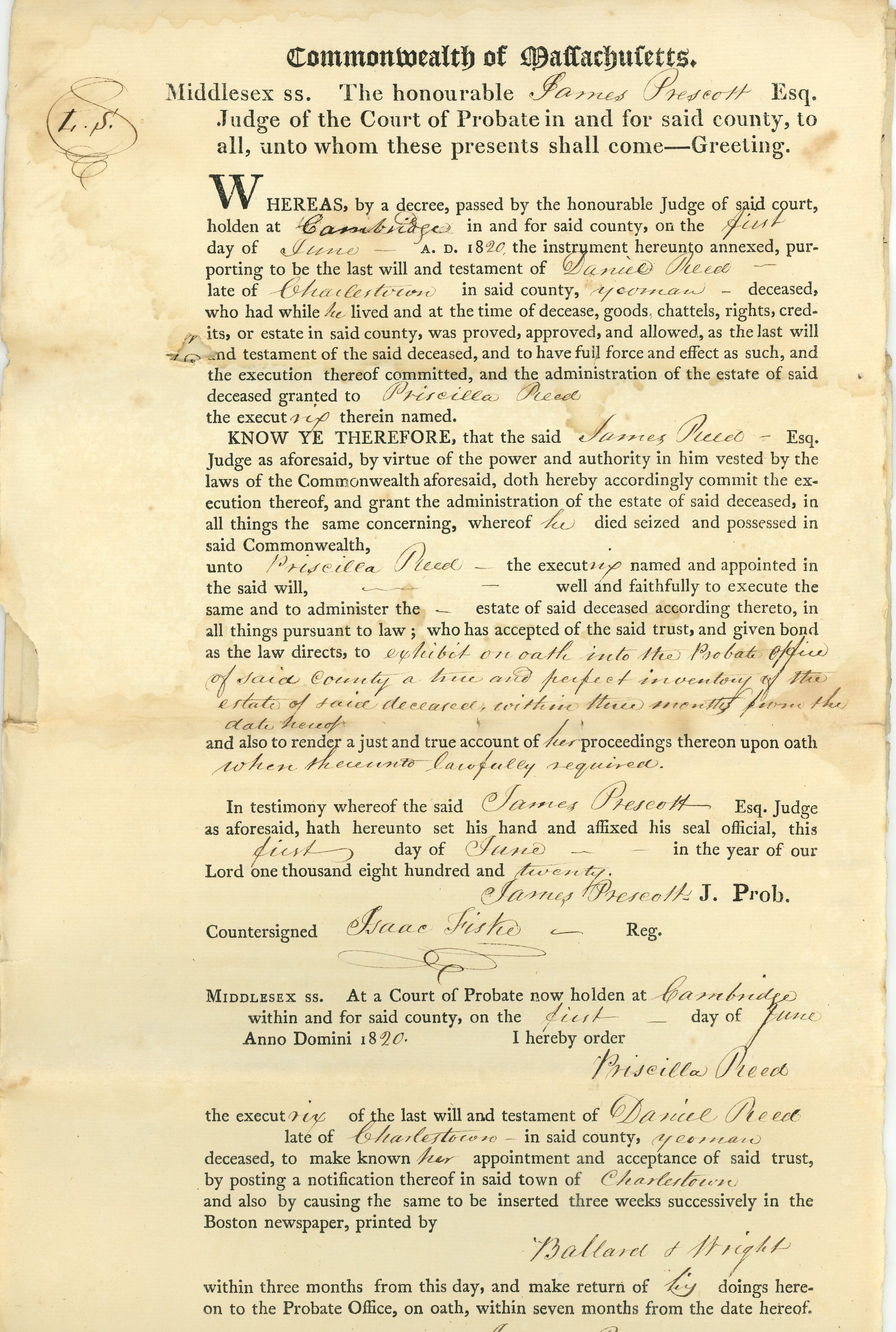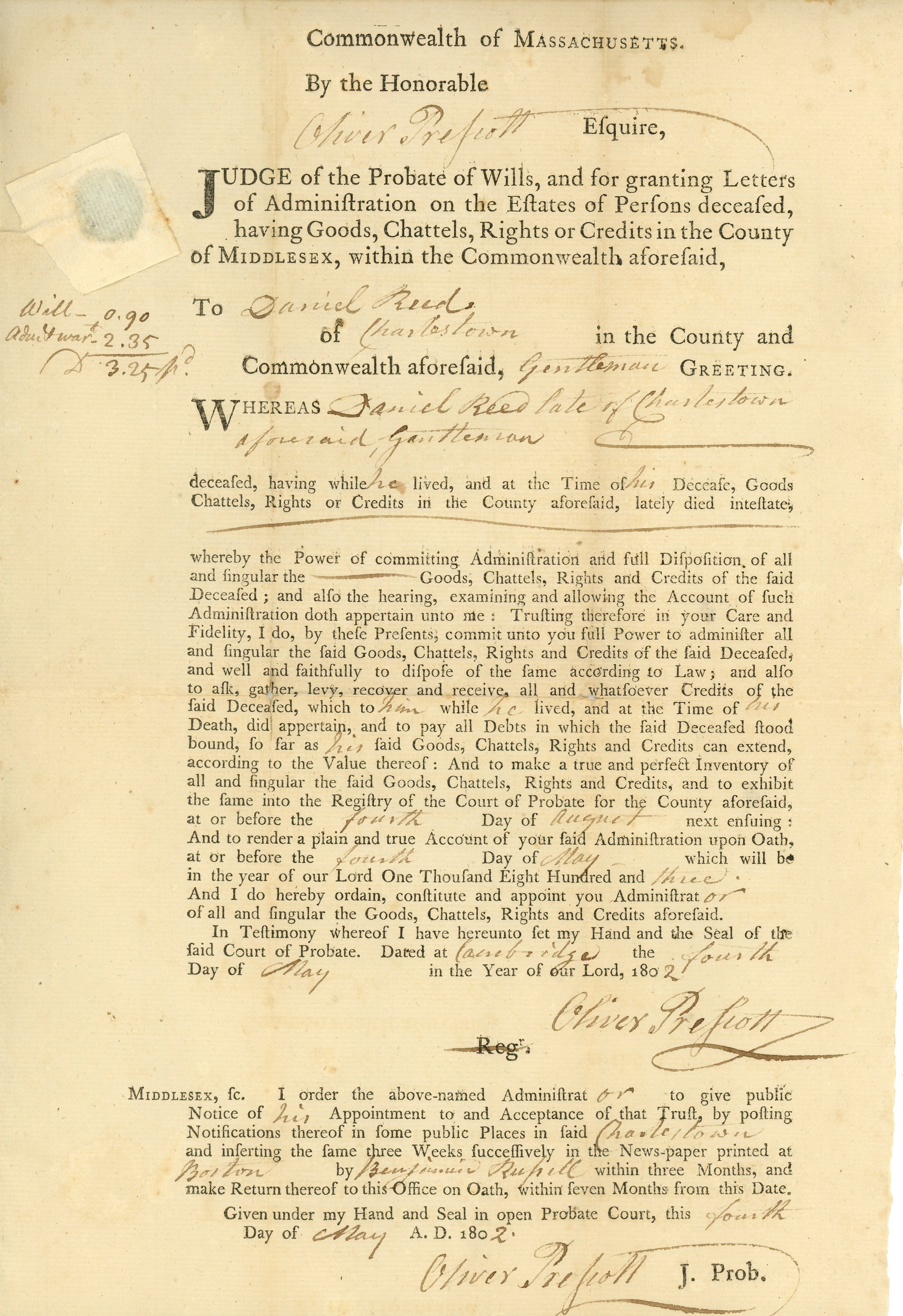 Even though he was frequently away at sea, Daniel was also an active member of society. In 1798, Daniel Reed, Seth Frost and Ebenezer Hall sent a notice to inhabitants of the Northwest Precinct in Cambridge (now Arlington) who owned real estate. The notice announced that they would assess real estate owners’ property. In the 18th century, town inhabitants were required to serve in public office. The town required precinct assessors to assess real estate in order to tax them accordingly.