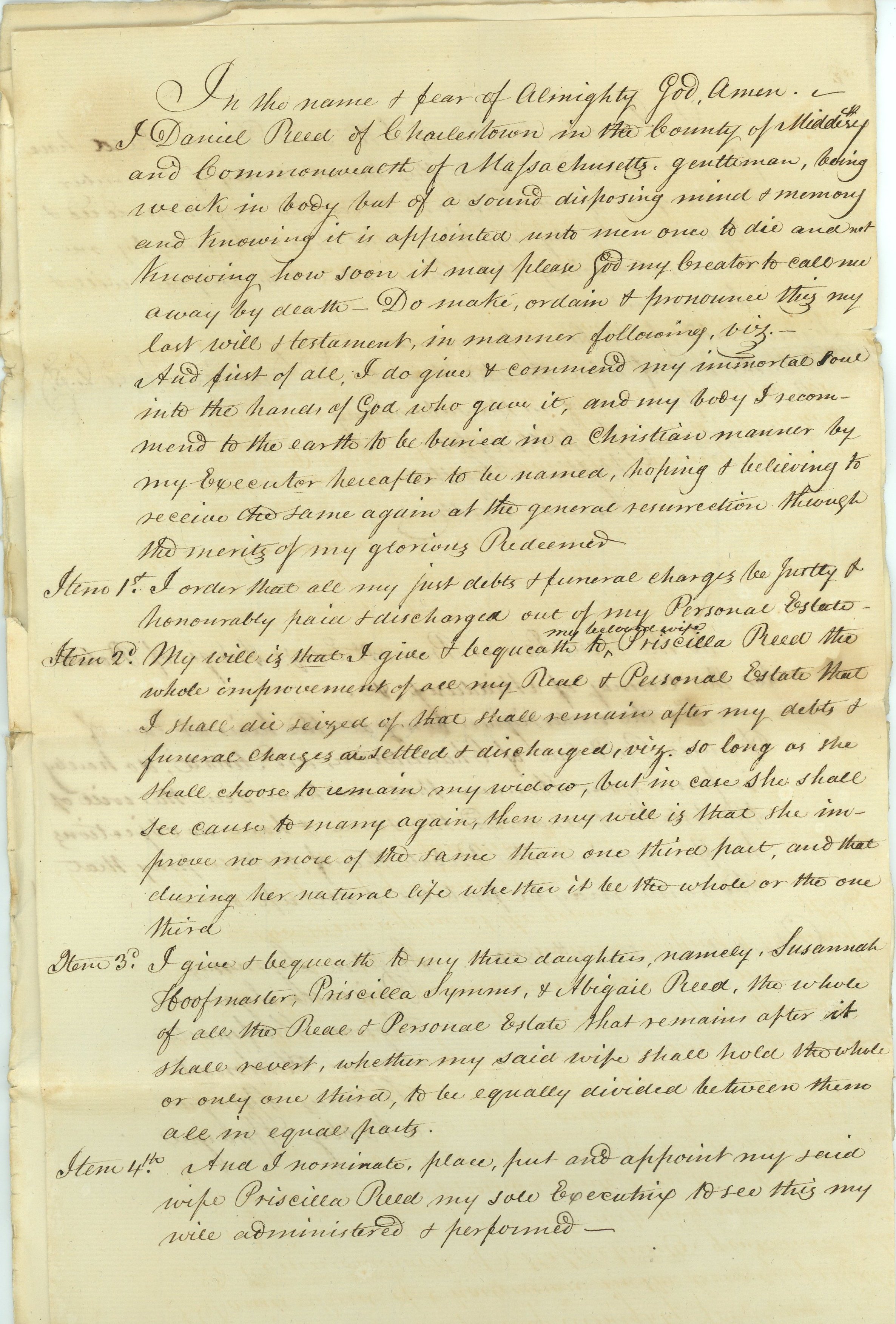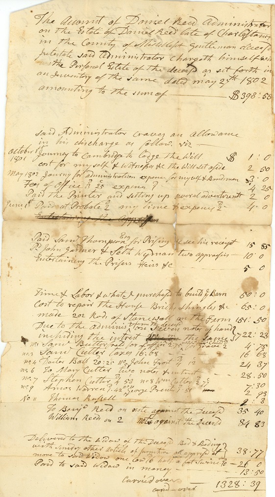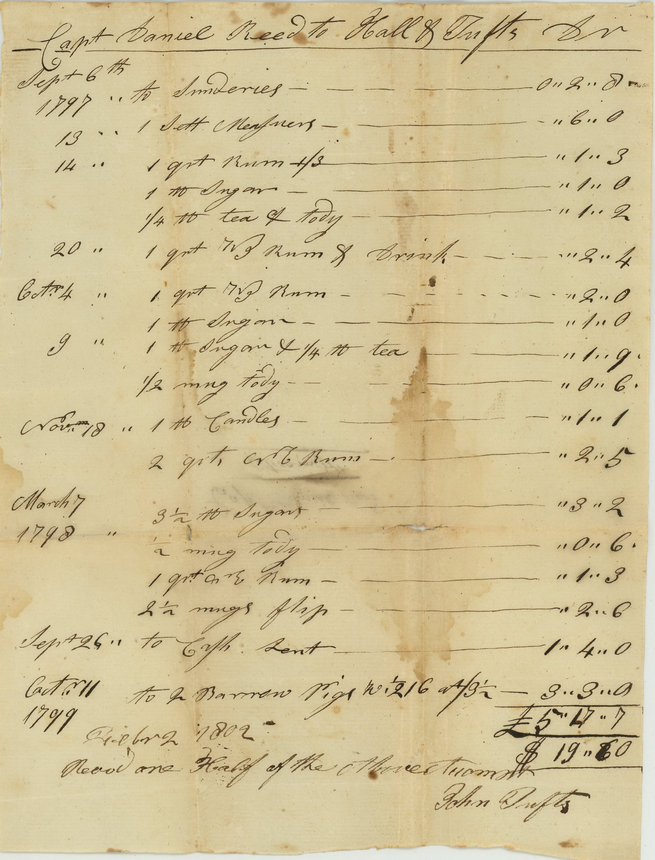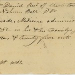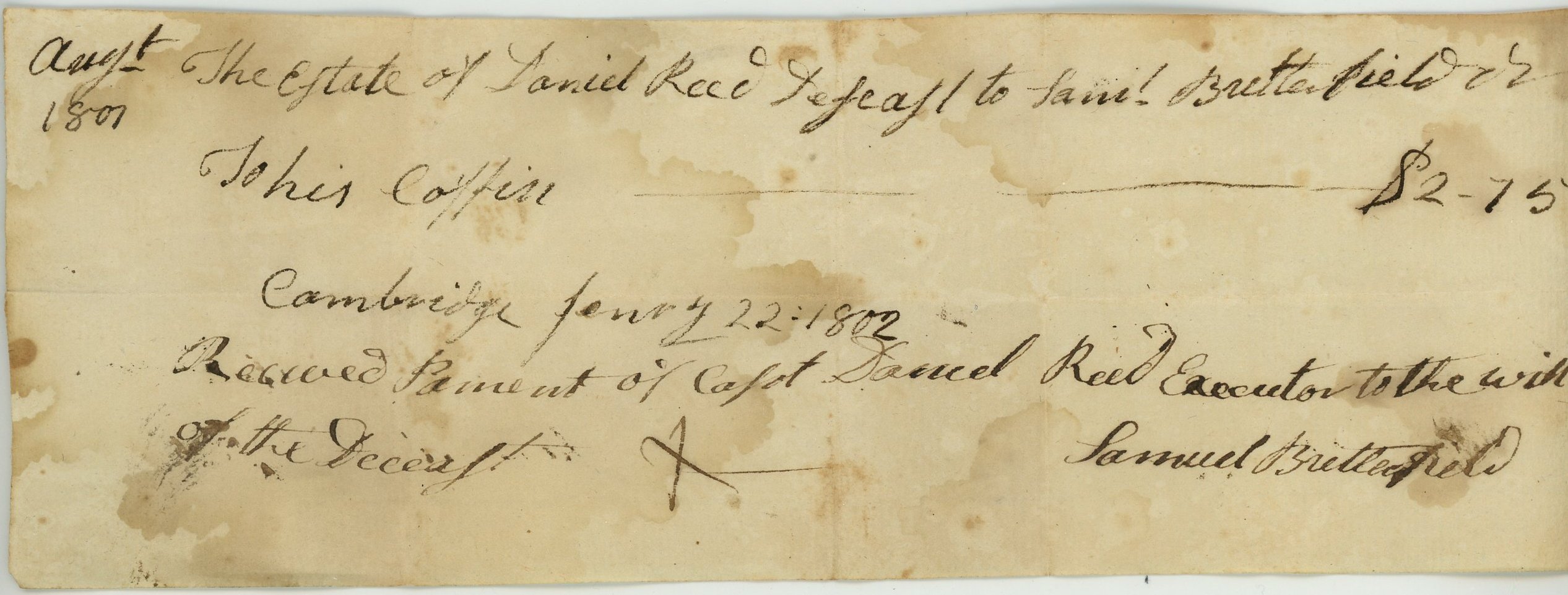 The majority of Captain Daniel Reed’s documents regard his father’s death in 1801. Upon his father’s death, the will appointed Captain Daniel executor of the estate. He was therefore responsible to pay all of his father’s expenses, such as his coffin, his funeral and even payments to his father’s doctor. Although he was responsible for settling all of his father’s debts, the will stipulated that two-thirds of the estate now belonged to Daniel.