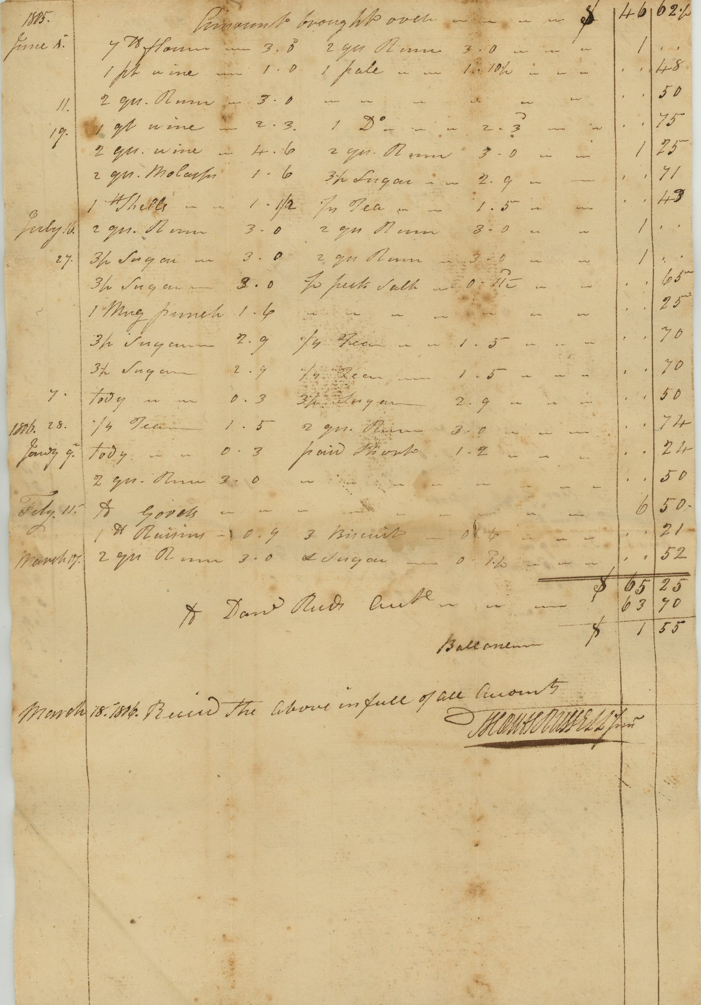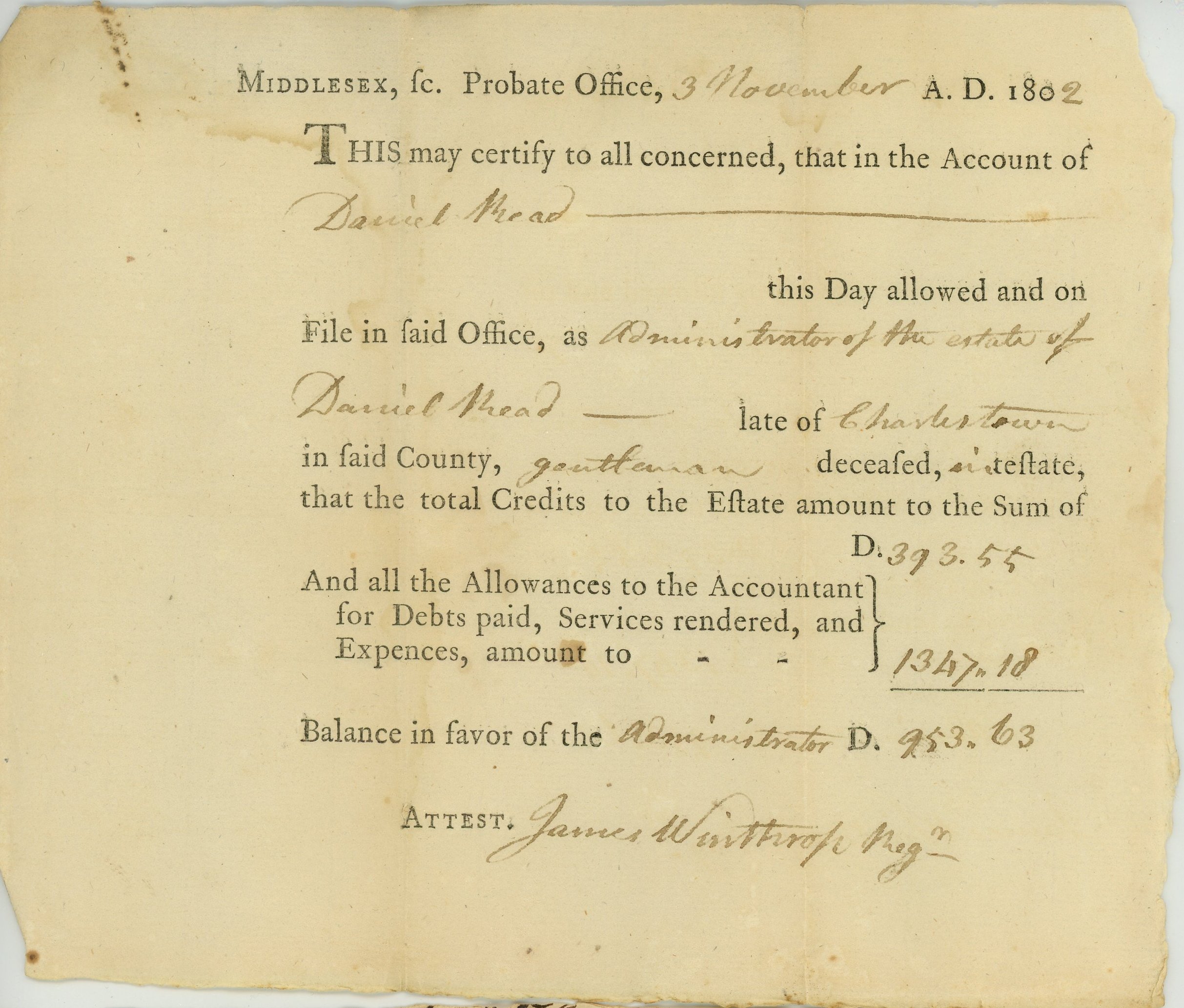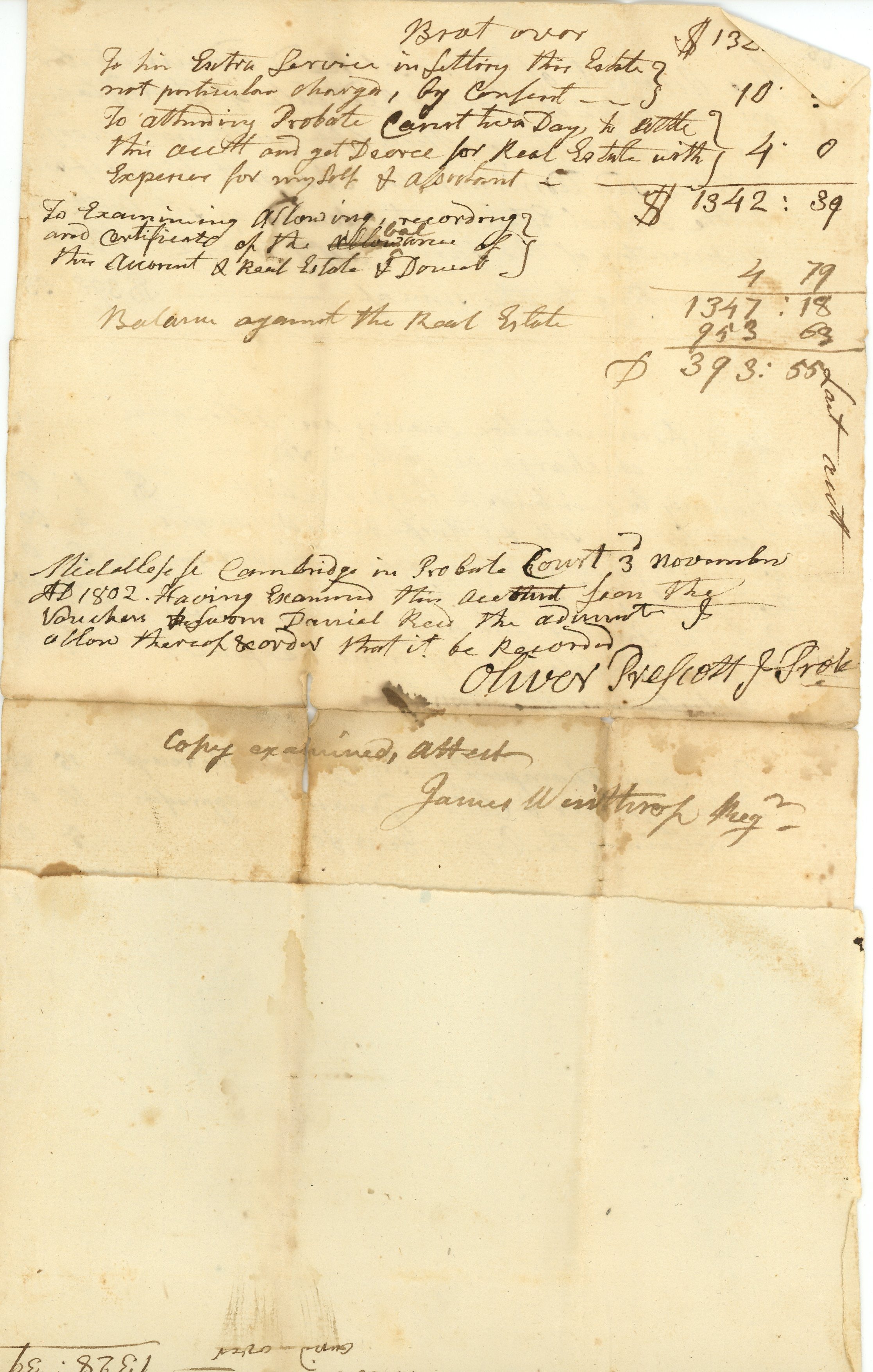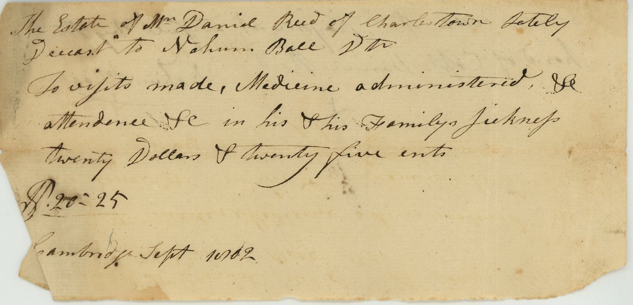 The majority of Captain Daniel Reed’s documents regard his father’s death in 1801. Upon his father’s death, the will appointed Captain Daniel executor of the estate. He was therefore responsible to pay all of his father’s expenses, such as his coffin, his funeral and even payments to his father’s doctor. Although he was responsible for settling all of his father’s debts, the will stipulated that two-thirds of the estate now belonged to Daniel.