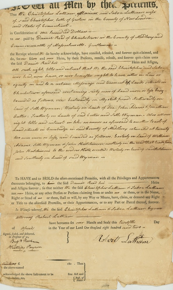 Captain Daniel Reed was born in approximately 1766 to Daniel and Dorothy Billings Reed. He married Priscilla Wyman Reed on November 26, 1789 and together they had six children: Susan, Priscilla, Abigail (Nabby), Daniel Jr., Martha and Mary. Daniel and his family lived in Northwest Cambridge (now Arlington). He was the first in his family to break away from farming. Out of all of the professions available to him, Daniel Reed chose the sea, and by the end of the 18th century, he was a captain.