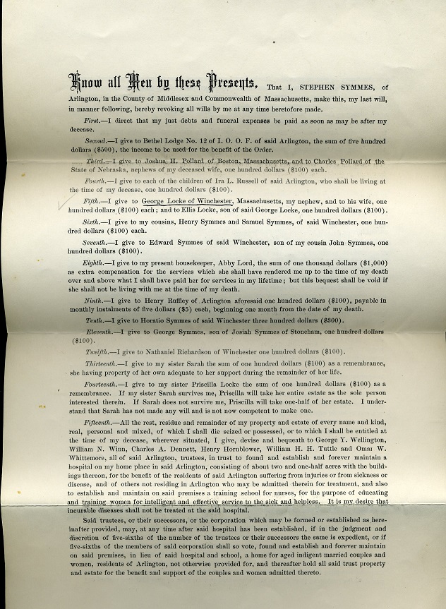 In his will, he left his entire estate, including the farm on Old Mystic Street (and personal property) to trustees to establish and forever maintain a hospital in Arlington. The estate inventoried at $30,000. The trustees found the house and location unsuitable to be a hospital, but the town eventually built a hospital elsewhere in Arlington 1912 in his name. Symmes hospital was an important part of Arlington in the 20th century. Many residents in Arlington and neighboring towns depended on the hospital for convenient medical care as well as employment. Symmes was the largest employer in Arlington with over 550 employees. The hospital unfortunately closed in 1992 and was a great loss to the community.