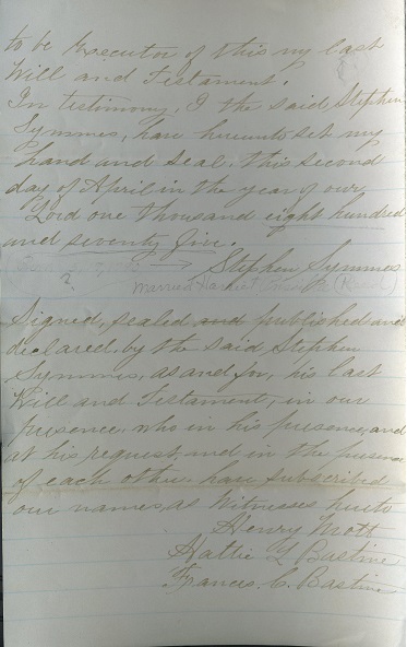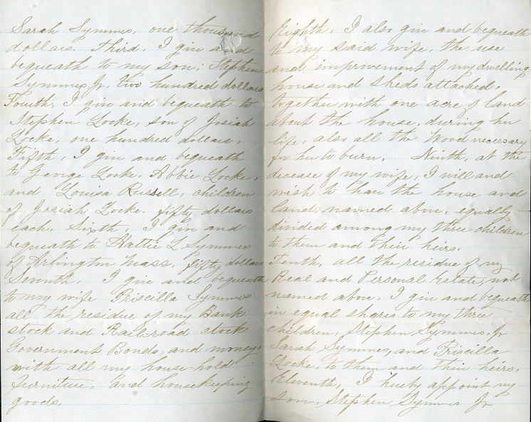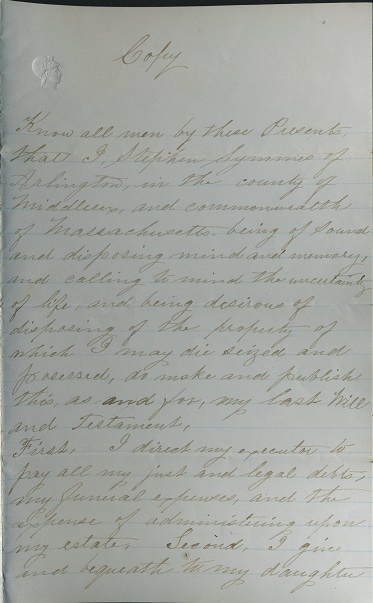 Stephen Symmes Jr. was the son of Stephen and Priscilla Reed Symmes. He lived on part of the farm that the eldest Daniel Reed bought from John Fowle in 1707. His home, now known as the Stephen Symmes home, is located on Crosby Street in Arlington. It is a Greek revival and is on the National Register of Historic Places.