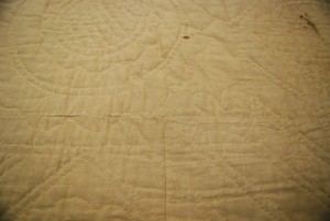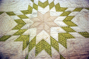 This now faded cream and green colored quilt was once bright and showy, with crisp white cotton, and bright lime-green flowers on a dark hunter-green…