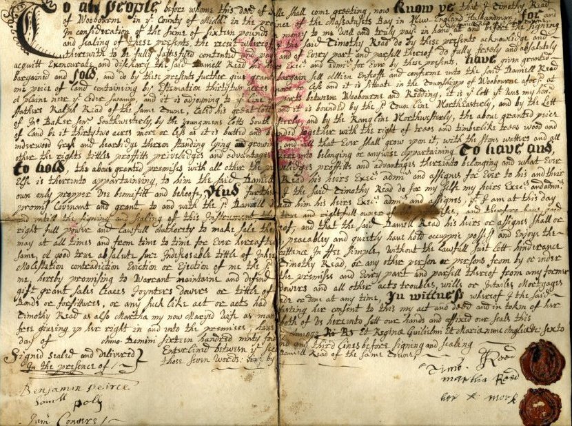 By 1698, Daniel was thirty-two years old and ready to start a family. In New England society, in order to begin this process, he needed land. He first bought land in his hometown of Woburn, and branched out to Charlestown (later part of Arlington) in the early 18th century. He bought this land from his brother Timothy in 1694. According to the oldest document in the Fowle-Reed-Wyman collection, Timothy sold the Sylvanus Wood Farm belonging to their father, Ralph Reed, to Daniel. Other documents in the collection demonstrate that Daniel purchased an additional 74 acres in Woburn from Joseph and Sarah Walker four years later in 1698. According to the deed, the land was “part plow land, part meadow and part swamp.” Meadows contained native plants that colonists used pasture or mowed for hay. Farmers even bought swamps, draining them to use as additional pastureland.