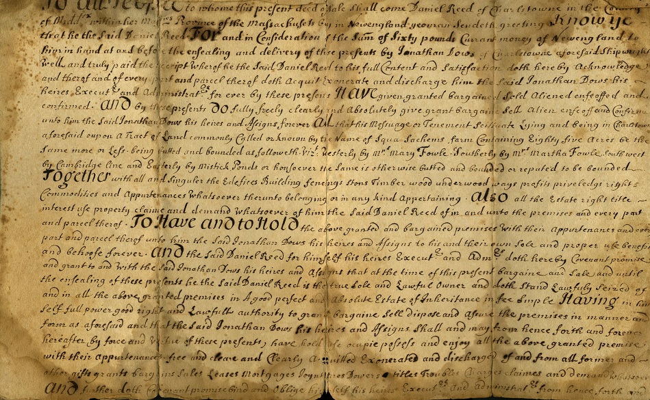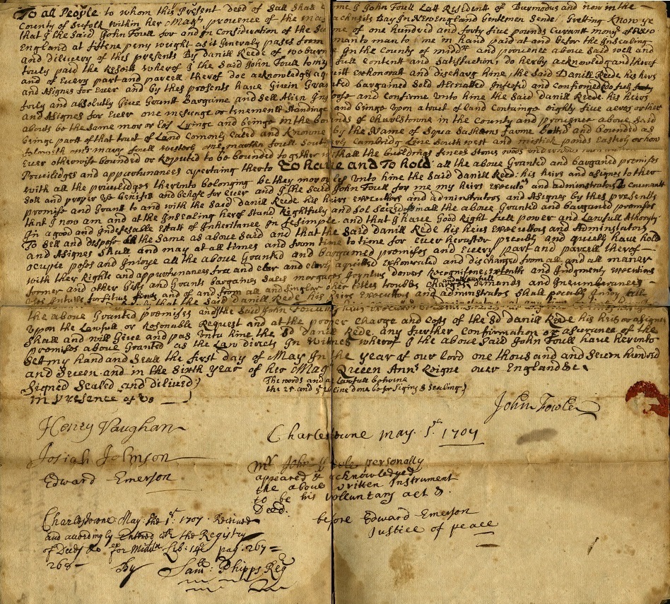 At some point in the early 18th century, Daniel decided to expand his real estate from Woburn to Charlestown (now part of Arlington). In May 1707, Daniel Reed purchased 85 acres in Charlestown from John Fowle. It was “a tract of land containing eighty five acres, or there abouts be the same more or less Lyinge and beinge in the Bounds of Charlestowne…beinge part of that tract of Land comony caled and knowne by the Name of Squa Sachems Farme…” Daniel and Susanna later purchased land adjacent to this farm from Martha Fowle Lybourn and Samuel Lybourn for £100. A week later, Daniel and Susanna rented this same land to Jonathan Dows, a shipwright, for only £60. In the deed it describes the home as a tenement, so Daniel and Susanna may have wanted the farm as additional income.