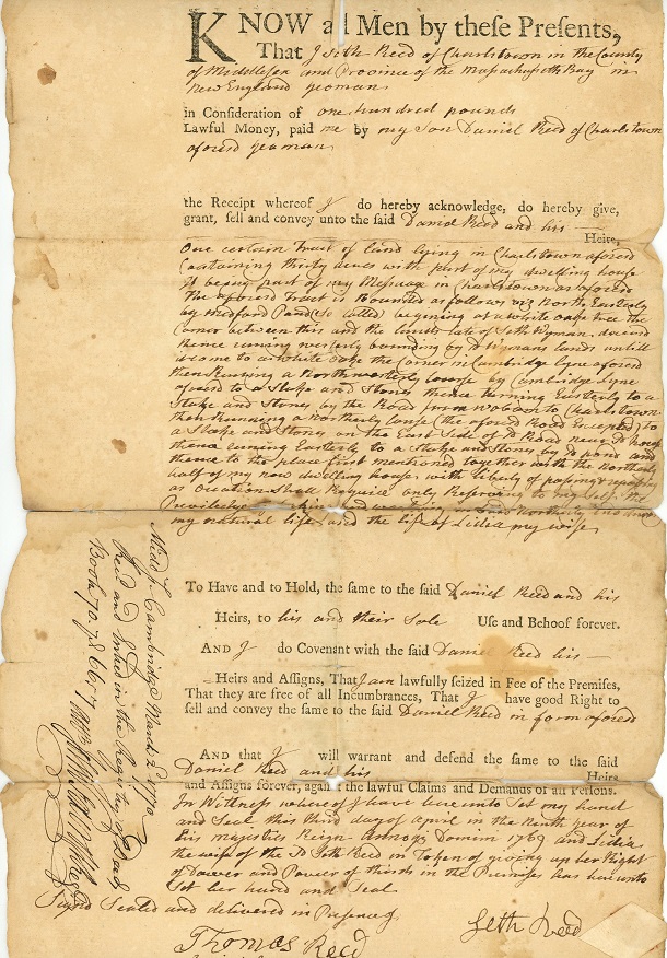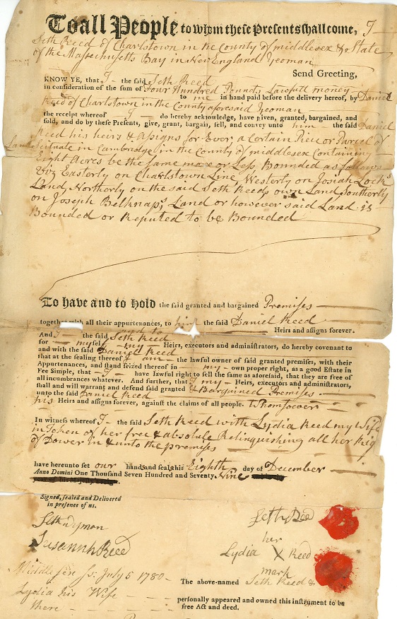 In 1769, Seth and Lydia deeded thirty acres of land and part of their house to their son Daniel for £100. Several years later in 1779, they deeded an additional eight acres of land to Daniel for £400. Both parcels of land were situated in West Cambridge (now Arlington). Although Daniel was a farmer like his father Seth, he was not as wealthy, owning a fraction of what Seth did in his lifetime. Daniel’s lack of fortune may be due to his active service in the military for most of his adult life.