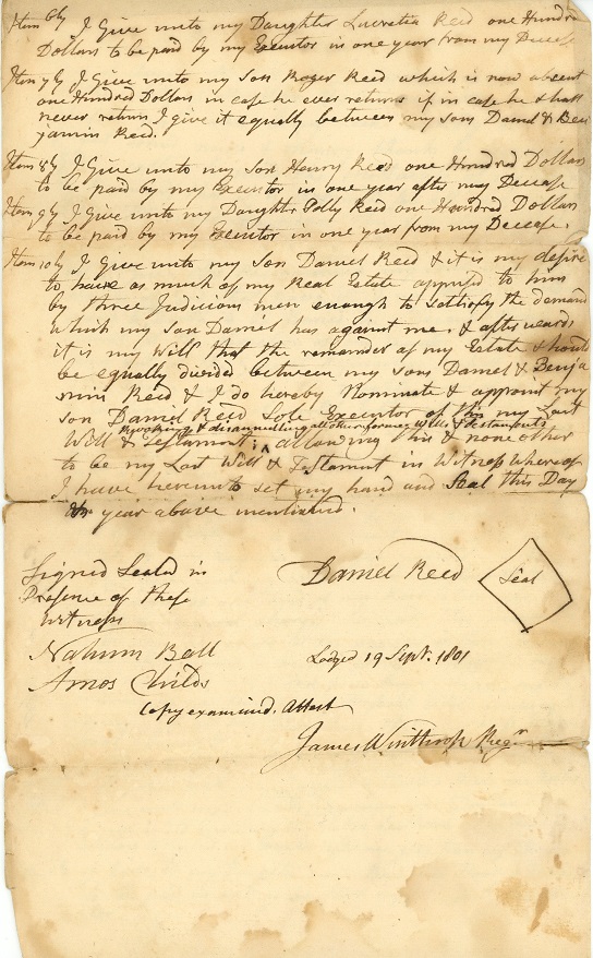 Aside from his involvement in the Revolutionary War, not much is known about Daniel Reed. The rest of his life seems to be a quiet one and he died in 1801 at the age of fifty-nine. His son, Daniel Reed,would be the first Reed to break away from agriculture.