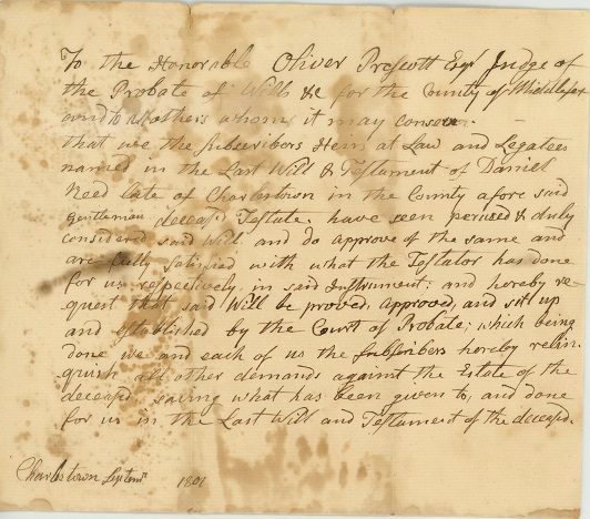In 1786, Daniel and his mother, Lydia, wrote up a contract allowing Daniel to use her farm, buildings and fields. Lydia did not remarry after Seth’s death and instead moved to Lexington to live with family members (presumably one of her children). That left her estate in Cambridge to her son, Daniel. When Lydia passed away in 1790, Daniel was also the executor of her estate.