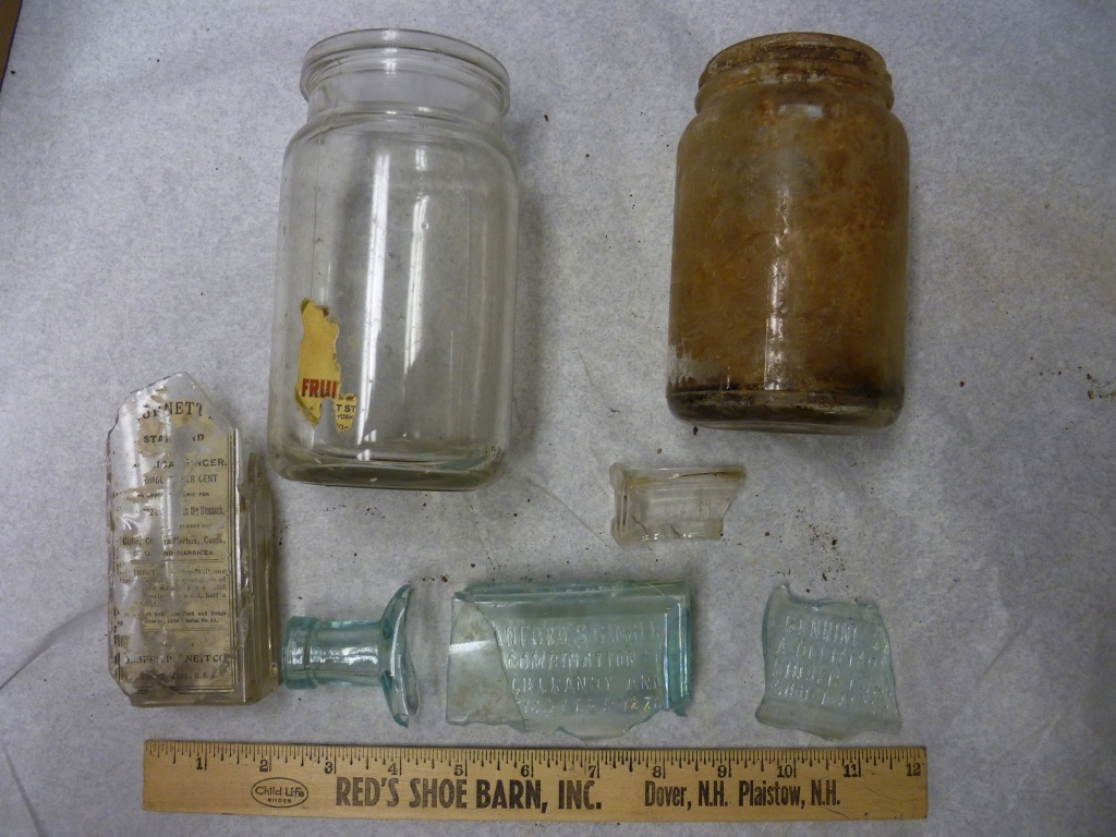 There are several ways archaeologists can tell approximately when a glass container was made. If it has distinct lines around the base of the container or distinct lines along the side, the vessel was made by an automatic machine, which means it was made after about 1910, when that method of manufacture became increasingly common. Sometimes the name of the product inside the glass vessel is embossed or printed on it, which makes it relatively easy to find when the vessel was in use for its intended purpose (e.g., beer, medicine, milk). Most of the glass vessels at the Russell House site were either entirely or partially machine-made, which means that they date to the early 20th century at the earliest. Many fragments are from vessels that don’t show this kind of diagnostic information, so it’s very hard to tell when they were made. It could be that earlier (or much earlier) vessels are part of this assemblage, but most of them are later.