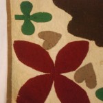 The swirling leaves, flowers, hearts and clovers, as well as the house, have been cut out of different types of thick wool. These pieces are woven or felted into soft and thick flat fabric, and then stitched onto the cream colored flannel backing with a method called ‘applique’. The abstract natural scene surrounds the small house, making a pastoral scene such as the origins of the Jason Russell House, or the town of Wales in 1848.