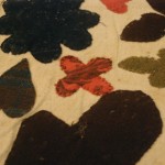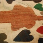 The quilt is beautiful, bright and lively, as well as very small. At just about two feet by four feet it may have been purely decorative. Small quilts were sometimes made to hang on a wall, drape over the sofa, or decorate another surface in the house. Since the quilt also shows very few signs of wear and tear, and the stitches on the quilt are not very tight, the quilt was very likely more for decoration than for warmth or sleeping.