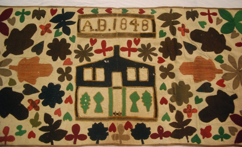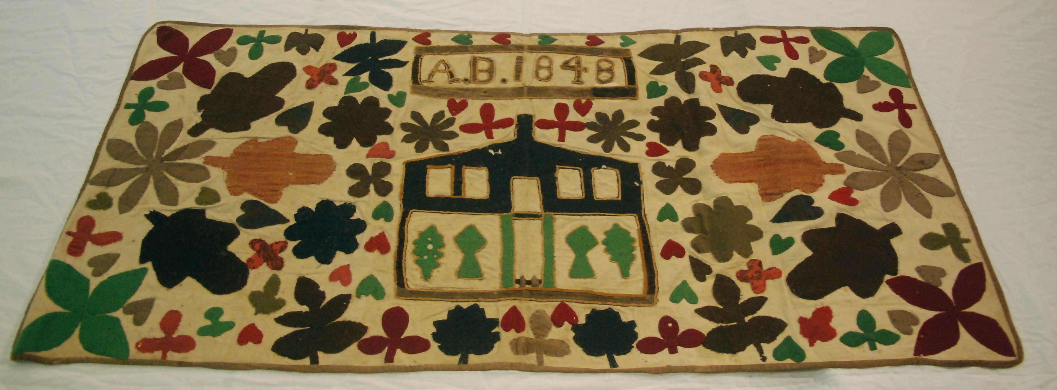 The Rourke quilt has a visual tie to the Jason Russell House, and Arlington History. Look closely at the central motif of the quilt. A small house with a central chimney and a central door are framed by windows on either side, with 5 windows above. It is the same exact architecture of the Jason Russell House! This style of house can also be seen all across New England, built from the 17th through the 19th century. In fact, the Wales Public Library, built in 1865 is also the same style. Whoever AB was, it is likely that this house existed in her everyday life, or perhaps in paintings or drawings, and the flora and fauna included surrounded them for inspiration.