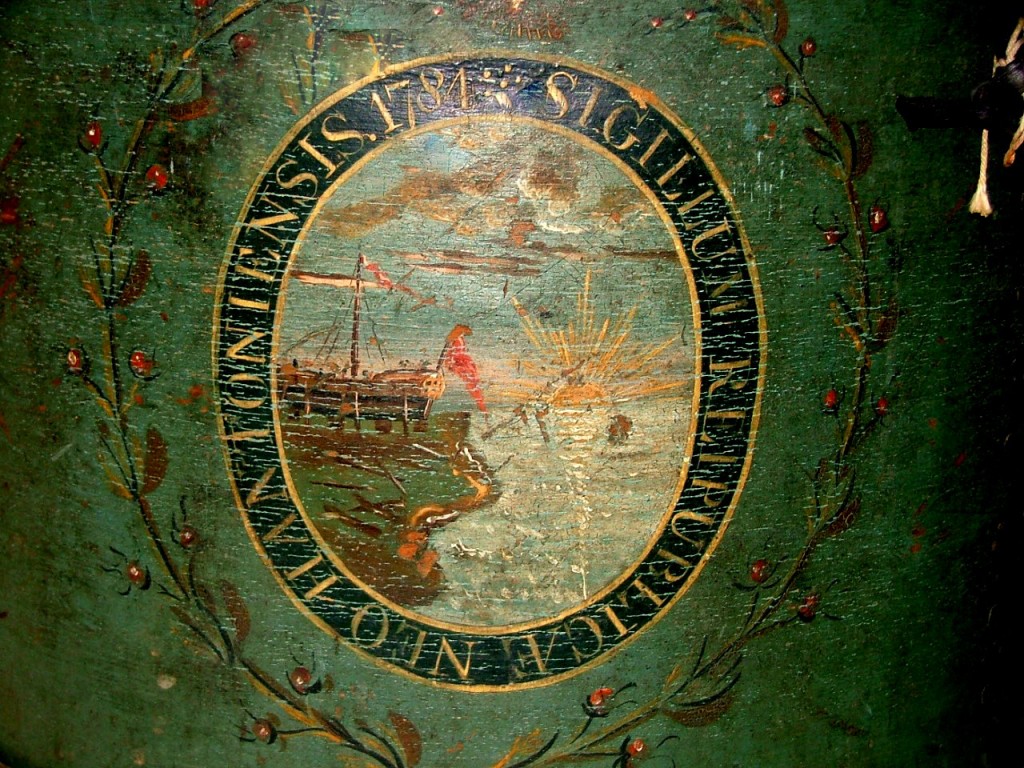 This beautiful drum, from The Arlington Historical Society collections, pictured here, is a lovely soft green with blue undertones. Wooden bands of a soft, sad red anchor the main green body of the artifact on either end, held together with neat rows of rivets. Emblazoned on one side is a painting of a ship and a sunrise. This circular central motif on the drum’s exterior is the 1784 New Hampshire seal—a ship, flying American banners, resting on wooden supports, with a rising sun. The scene celebrates New Hampshire’s role as a major ship-building center during the Revolutionary War period. The seal is surrounded by laurel leaves and the Latin phrase: “Sigilium Reipublicae Neo Hantoniensis.” (the commonwealth of New Hampshire). Inside, written in a neat hand is the number “23” set at an angle. We are on solid ground interpreting the drum’s physical attributes. But, who owned this beautiful thing; who used it, and why?